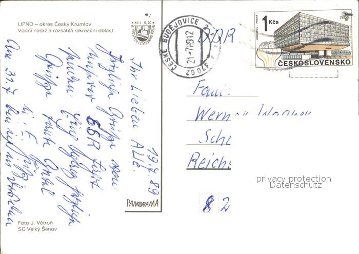 old postcard Lipno Vodni nadrz a rozsahla rekreacni oblast Sonnenuntergang Hotel Bootsanleger Windsurfen postalisch gelaufen Erhaltung siehe scans