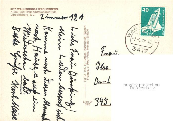73164945 alte Postkarte Lippoldsberg Klinik und Rehazentrum Fliegeraufnahme postalisch gelaufen Erhaltung siehe scans [WerneD78] KatCode: 11110006633027