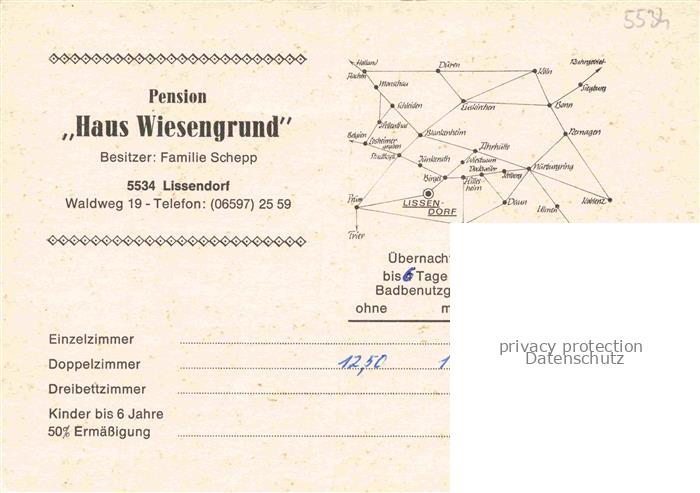 74055225 Lissendorf Vulkaneifel Rheinland-Pfalz Felsen am Burgberg Haus Wiesengrund Blick vom Burgberg Freibad postalisch nicht gelaufen Werbekarte (keine Postkarte) Erhaltung siehe scans [WerneD78] KatCode: 11110007233041