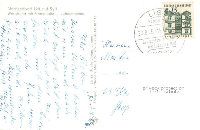 73764774 alte Postkarte List Sylt Weststrand mit Strandhalle Nordseebad postalisch gelaufen Fliegeraufnahme Erhaltung siehe scans [FriedD77] KatCode: 11110001054078