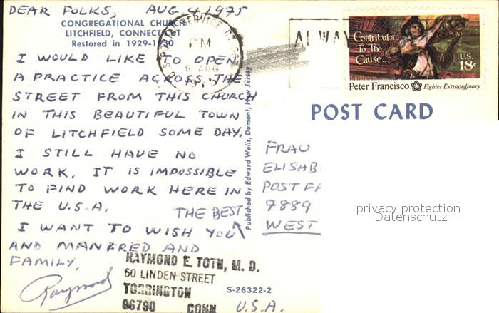 72613540 old postcard Litchfield Connecticut Congregational Church postalisch gelaufen Erhaltung siehe scans [WerneD78] KatCode: 14140070000000