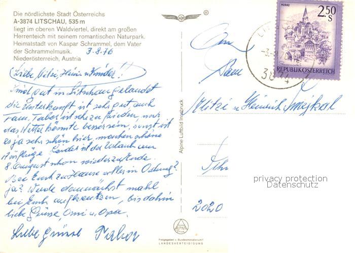 73167767 alte Postkarte Litschau Fliegeraufnahme Herrenteich Kaspar Schrammel Schrammelmusik postalisch gelaufen Erhaltung siehe scans [LiesaD40] KatCode: 11390124030925