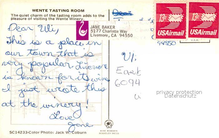 72707458 old postcard Livermore California Wente Tasting Room postalisch gelaufen Erhaltung siehe scans [LiesaD40] KatCode: 14140050000000
