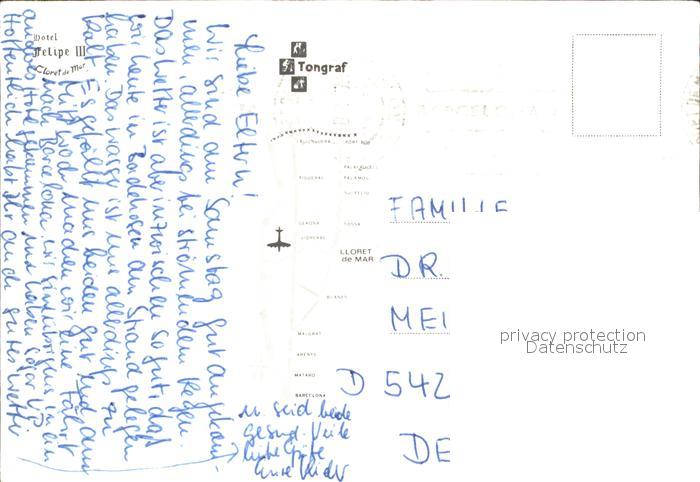 old postcard Lloret de Mar Hotel Felipe III postalisch gelaufen Erhaltung siehe scans