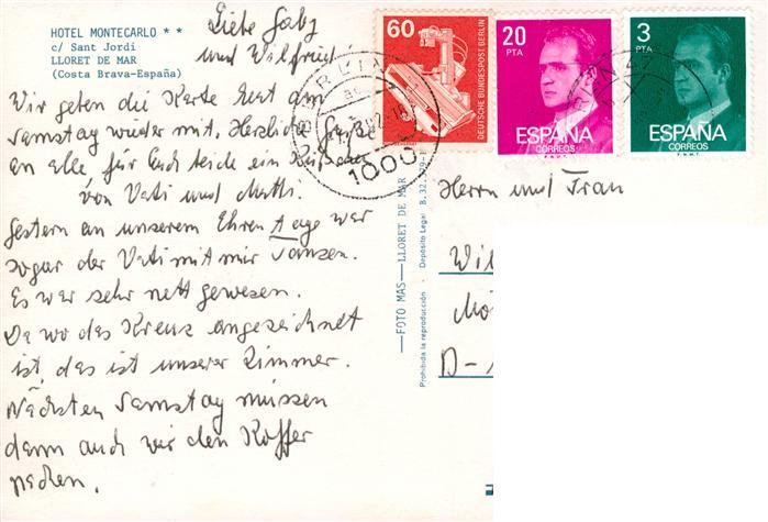 73904892 old postcard Lloret de Mar Hotel Montecarlo Pool Gastraum Bar postalisch gelaufen Erhaltung siehe scans [WerneD78] KatCode: 11510