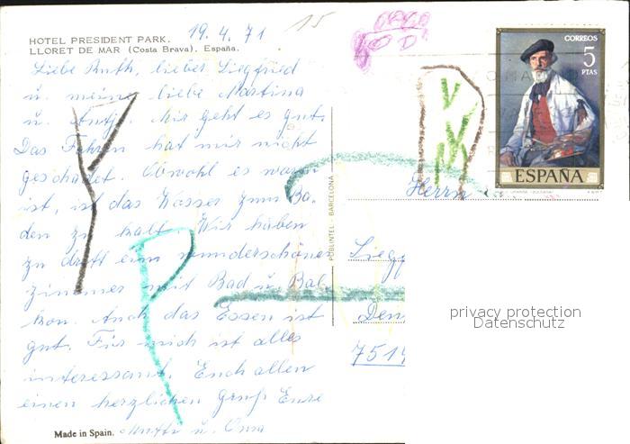 old postcard Lloret de Mar Hotel President Park postalisch gelaufen Erhaltung siehe scans