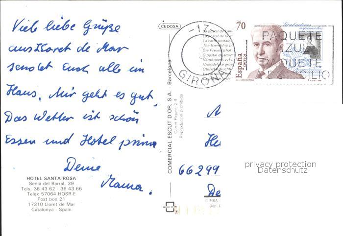 old postcard Lloret de Mar Hotel Santa Rosa postalisch gelaufen Erhaltung siehe scans