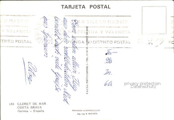 old postcard Lloret de Mar Strand Promenade Brunnen Kueste Nachtaufnahme postalisch gelaufen Erhaltung siehe scans