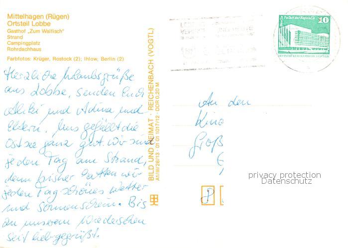 73830438 alte Postkarte Lobbe Middelhagen Ruegen Gasthof Zum Walfisch Strand Campingplatz Rohrdachhaus postalisch gelaufen Erhaltung siehe scans [WerneD78] KatCode: 11110013061023