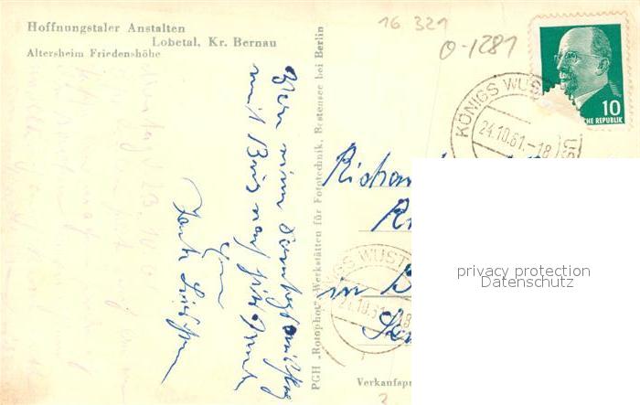43351577 alte Postkarte Lobetal Hoffnungstaler Anstalten Altersheim Friedenshoehe postalisch gelaufen Erhaltung siehe scans [KathaD81] KatCode: 11110012060020