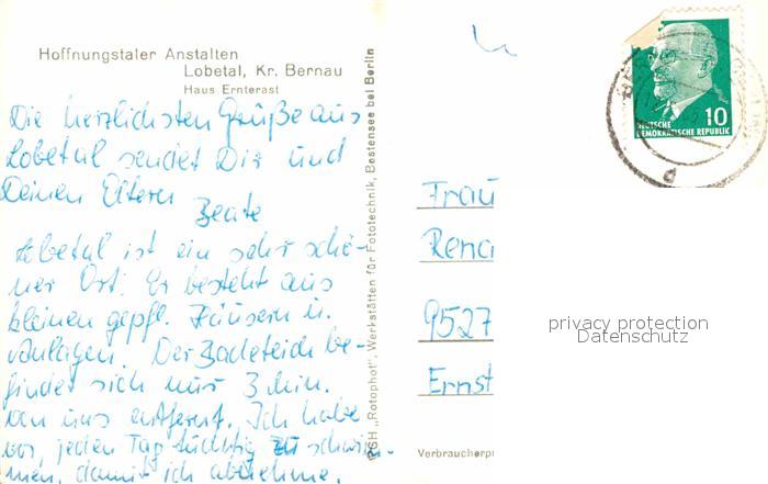 72698628 alte Postkarte Lobetal Hoffnungstaler Anstalten Haus-Ernterast postalisch gelaufen Erhaltung siehe scans [LiesaD40] KatCode: 11110012060020