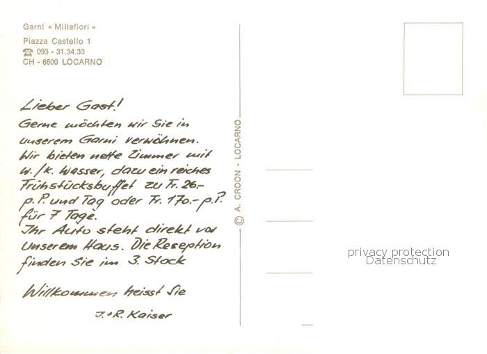 13852524 Locarno Lago Maggiore TI Garni Millefiori Piazza Castello postalisch nicht gelaufen Erhaltung siehe scans [WerneD78] KatCode: 11470210655962