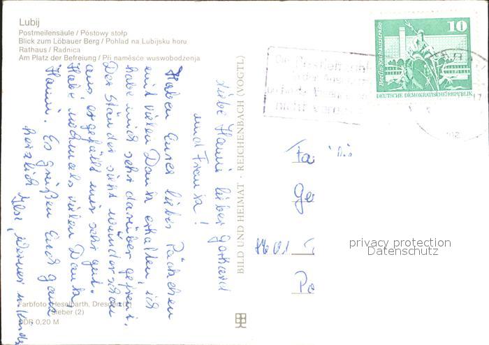 72315055 alte Postkarte Loebau Sachsen Postmeilensaeule Loebauer Berg Rathaus Platz der Befreiung postalisch gelaufen Erhaltung siehe scans KatCode: 11110014286230