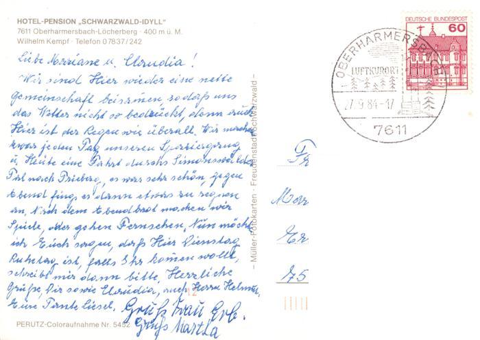 73927990 Loecherberg Oberharmersbach Hotel Pension Schwarzwald-Idyll postalisch gelaufen Erhaltung siehe scans [FriedD77] alte Postkarte Frie Katcode 11110008317088