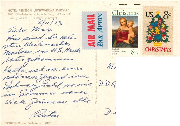 73928407 Loecherberg Oberharmersbach Hotel Pension Schwarzwald Idyll Gastraeume Terrasse postalisch gelaufen Erhaltung siehe scans [FriedD77] alte Postkarte Frie Katcode 11110008317088