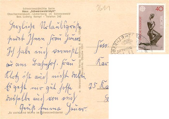 73928053 Loecherberg Oberharmersbach Schwarzwaldmuehle beim Haus Schwarzwald-Idyll postalisch gelaufen Erhaltung siehe scans [FriedD77] alte Postkarte Frie Katcode 11110008317088