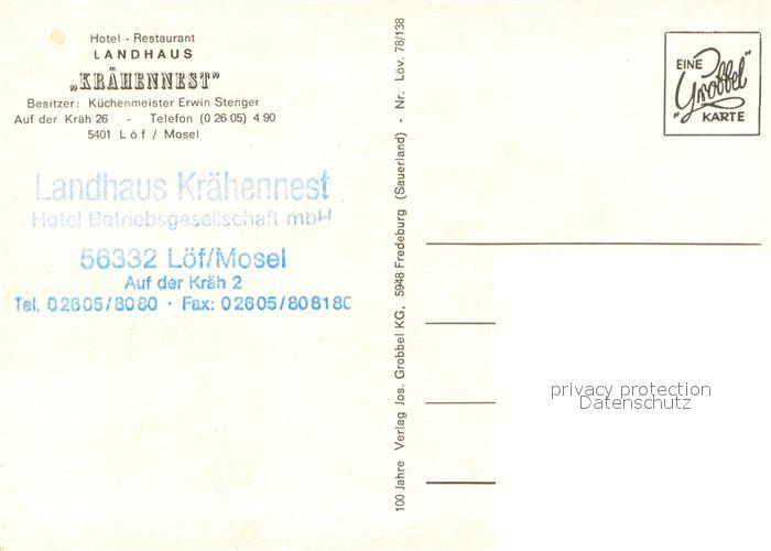 73649012 Loef Mosel Hotel Restaurant Landhaus Kraehennest postalisch nicht gelaufen Erhaltung siehe scans [FriedD77] KatCode: 11110007137214