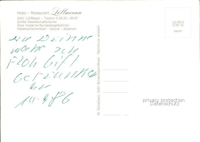 72275386 Loef Mosel Hotel Restaurant Lellmann postalisch nicht gelaufen Erhaltung siehe scans KatCode: 11110007137214