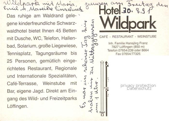 73089355 Loeffingen Hotel Wildpark Cafe Restaurant Weinstube postalisch nicht gelaufen Werbekarte (keine Postkarte) Erhaltung siehe scans [KathaD81] KatCode: 11110008315070