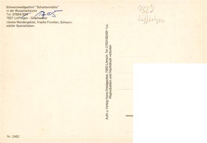73932533 Loeffingen Schwarzwaldgasthof Schattenmuehle Gastraeume Zimmer Lothenbach Klamm Wutachschlucht postalisch nicht gelaufen Erhaltung siehe scans [FriedD77] KatCode: 11110008315070