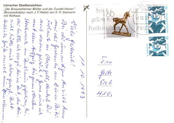 73879007 LoeRRACH Baden BW Bronzeskulptur Der Brassenheimer Muellerund der Zundel Heiner mit Rathaus postalisch gelaufen Erhaltung siehe scans [WerneD78] alte Postkarte Wern Katcode 11110008336050