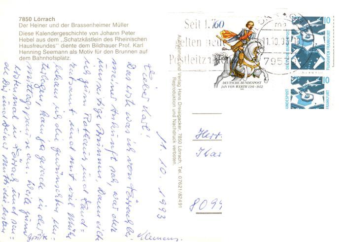 73879008 LoeRRACH Baden BW Bronzeskulptur Der Zundelheiner und der Brassenheimer Mueller postalisch gelaufen Erhaltung siehe scans [WerneD78] alte Postkarte Wern Katcode 11110008336050