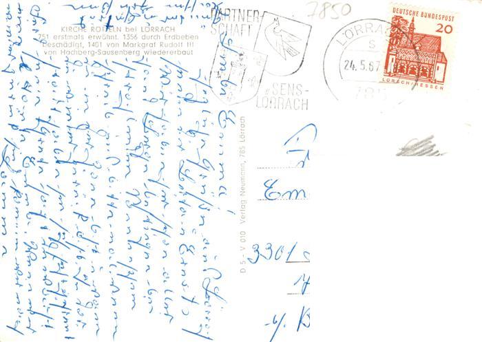 73903057 LoeRRACH Baden BW Kirche Roetteln Inneres Markgraf Rudolf III von Hachberg Sausenberg Anna von Freiburg postalisch gelaufen Erhaltung siehe scans [WerneD78] alte Postkarte Wern Katcode 11110008336050
