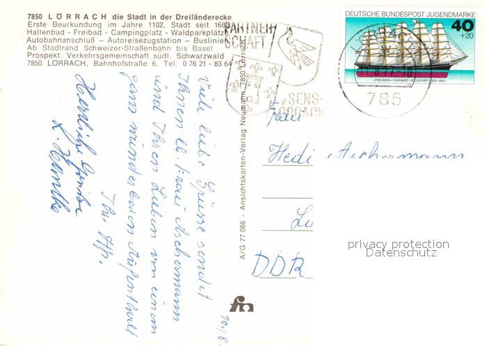 72628594 alte Postkarte Loerrach Burgruine Roetteln Marktplatz Koenigsbau AOK Hebelpark Schweizer Grenze postalisch gelaufen Erhaltung siehe scans [WerneD78] KatCode: 11110008336050