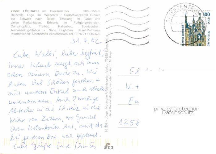 72681828 alte Postkarte Loerrach Fussgaengerzone Skulpturen Schloss Stetten Glockenspiel Campingplatz Dreilaendereck postalisch gelaufen Erhaltung siehe scans [FriedD77] KatCode: 11110008336050