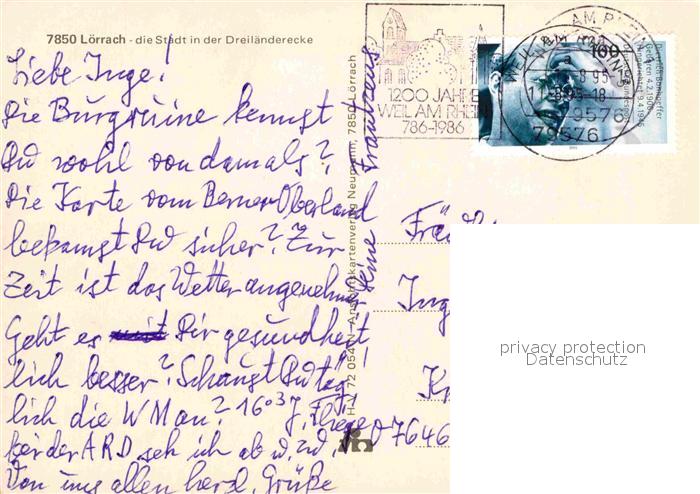 72856407 alte Postkarte Loerrach Hauptbahnhof Rosenfelspark Burgruine Roetteln Staedt Altersheim Basler Str RWL Sportplatz Traemlis letzte Fahrt Schwimmbad postalisch gelaufen Erhaltung siehe scans [WerneD78] KatCode: 11110008336050