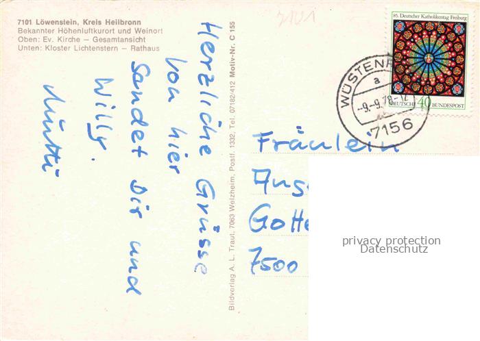 74052798 alte Postkarte Loewenstein Heilbronn BW Teilansichten Kirche Kloster Lichtenstern Rathaus postalisch gelaufen Erhaltung siehe scans [FriedD77] KatCode: 11110008125059