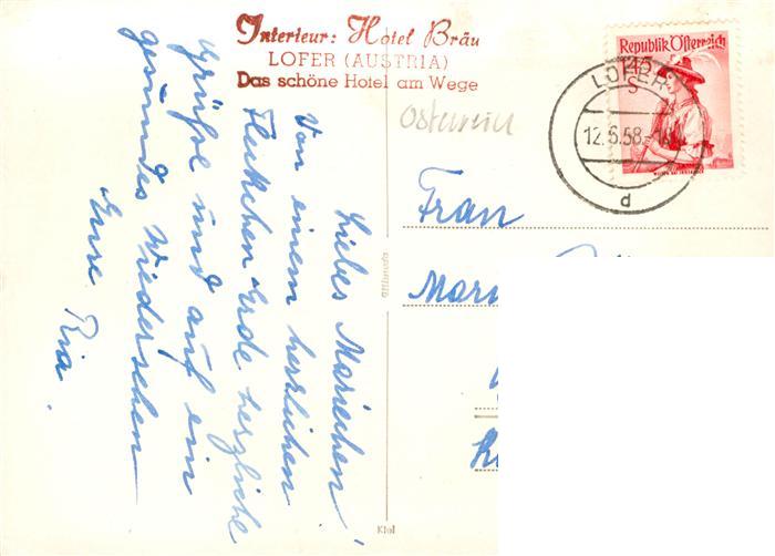 73923635 alte Postkarte Lofer AT Hotel Braeu Gaststube postalisch gelaufen Erhaltung siehe scans [FriedD77] KatCode: 11390322050610