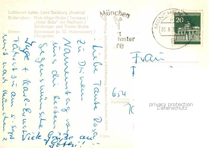 72904232 alte Postkarte Lofer Hotel Braeu Rich.-Mayr-Stube Reifhorn postalisch gelaufen Erhaltung siehe scans [NatalD47] KatCode: 11390322050610