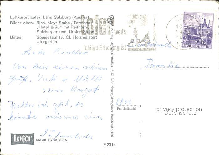 72277219 alte Postkarte Lofer Hotel Braeu Rich.-Mayr-Stube Ufergarten postalisch gelaufen Erhaltung siehe scans KatCode: 11390322050610
