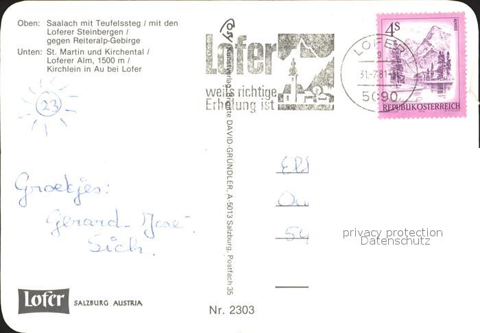 72092302 alte Postkarte Lofer Saalach mit Teufelssteg Loferer Steinberge Reiteralp St Martin Kirchental Loferer Alm Kirchlein in Au postalisch gelaufen Erhaltung siehe scans KatCode: 11390322050610
