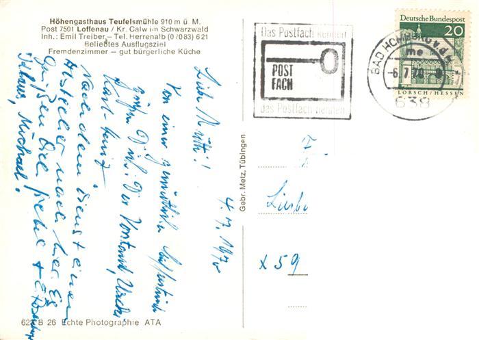 73947106 alte Postkarte Loffenau Bad Herrenalb Hoehengasthaus Teufelsmuehle Aussichtsturm Schwarzwald postalisch gelaufen Erhaltung siehe scans [FriedD77] KatCode: 11110008235033