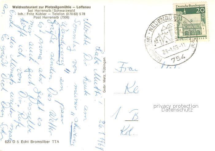 73644502 alte Postkarte Loffenau Bad Herrenalb Waldrestaurant zur Plotzsaegemuehle im Schwarzwald Wasserrad Bruecke Wasserfall postalisch gelaufen Erhaltung siehe scans [FriedD77] KatCode: 11110008235033