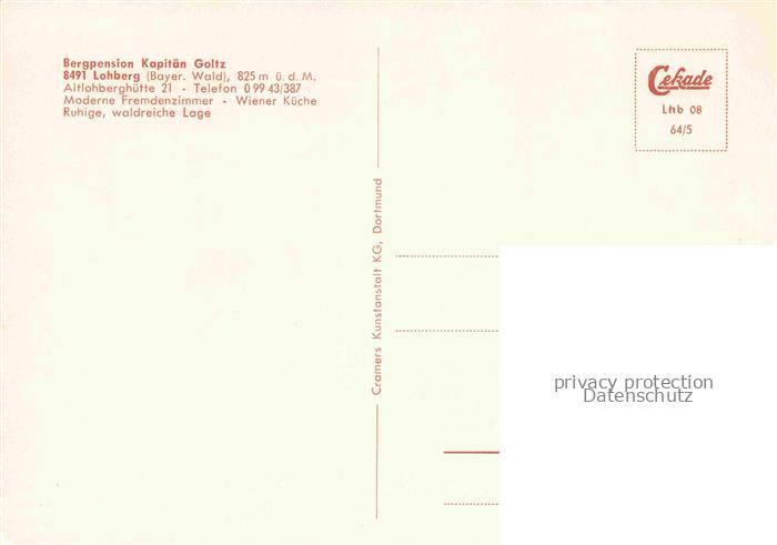 74049772 Lohberg Lam Bergpension Kapitaen Goltz Bayerischer Wald postalisch nicht gelaufen Erhaltung siehe scans [FriedD77] KatCode: 11110009372178