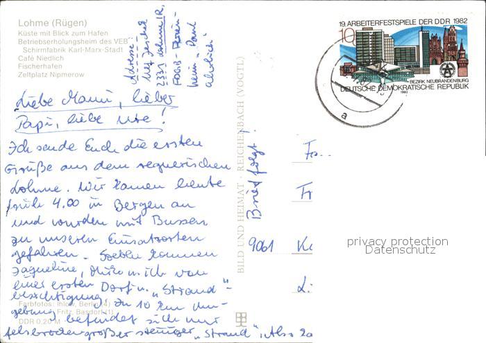 72418308 alte Postkarte Lohme Ruegen Kueste Betriebserholungsheim Cafe Niedlich Fischereihafen Zeltplatz Nipmerow postalisch gelaufen Erhaltung siehe scans KatCode: 11110013061022