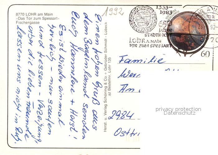 73067080 alte Postkarte Lohr Main Fischergasse postalisch gelaufen Erhaltung siehe scans [NatalD47] KatCode: 11110009677155