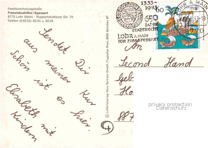 72844003 alte Postkarte Lohr Main Fliegeraufnahme Franziskushoehe postalisch gelaufen Erhaltung siehe scans [AndreD76] KatCode: 11110009677155