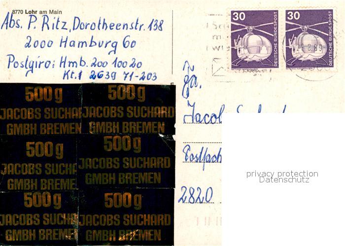 73213827 alte Postkarte Lohr Main Kirche Blick ueber den Main Altstadt Bayersturm Freibad Schloss Schweinskulptur postalisch gelaufen Erhaltung siehe scans [FriedD77] KatCode: 11110009677155