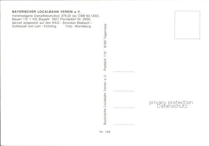 Lokomotive 378.32 Bayerischer Localbahn Verein postalisch nicht gelaufen Erhaltung siehe scans