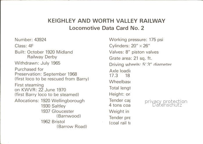 Lokomotive 43924 Keighley and Worth Valley Railway postalisch nicht gelaufen Keine Postkarte (siehe scan) Erhaltung siehe scans