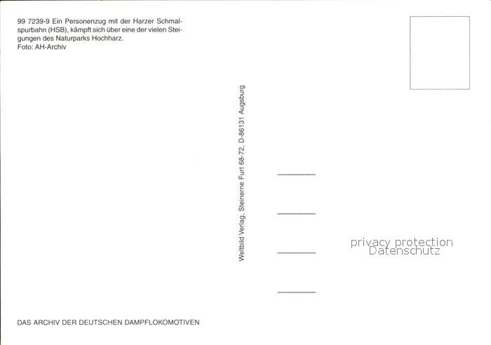 Lokomotive 99 7239-9 Harzer Schmalspurbahn Naturpark Hochharz postalisch nicht gelaufen Erhaltung siehe scans