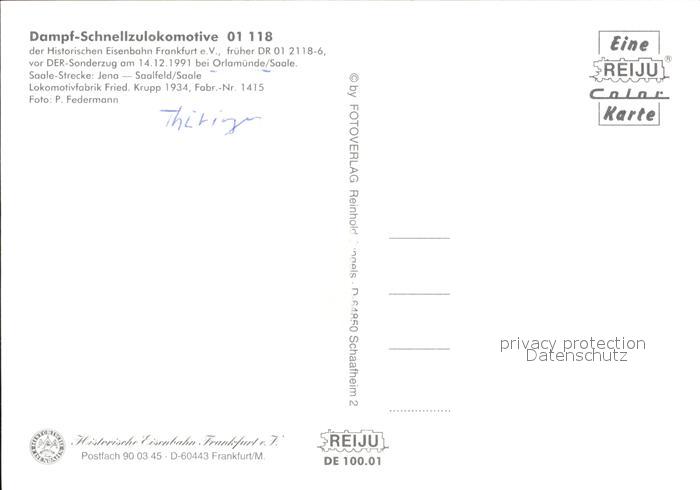 Lokomotive Dampf-Schnellzuglokomotive 01 118 Orlamuende Saale postalisch nicht gelaufen Erhaltung siehe scans