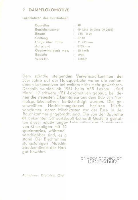 Lokomotive Dampflokomotive 997245-6 Harzbahn postalisch nicht gelaufen Keine Postkarte (siehe scan) Erhaltung siehe scans [PaolaD17]