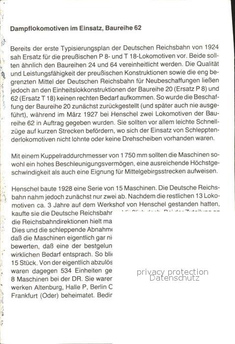 Lokomotive Dampflokomotive Baureihe 62 postalisch nicht gelaufen Erhaltung siehe scans