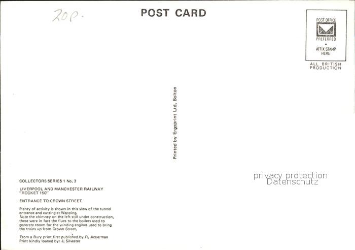 Lokomotive Liverpool and Manchester Railway Entrance Crown Street postalisch nicht gelaufen Erhaltung siehe scans