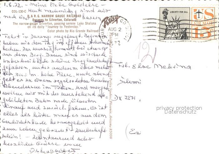 alte Postkarte Lokomotive Narrow Gauge Railroad Durango to Silverton Colorado Lake Shalona postalisch gelaufen Erhaltung siehe scans
